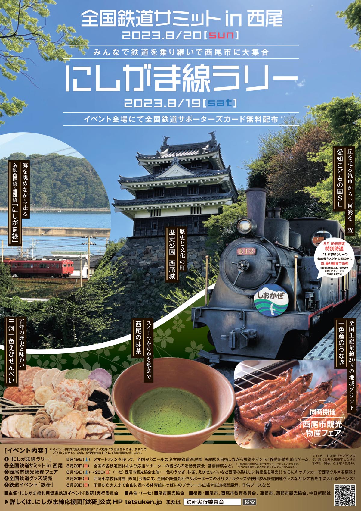 8月20日(日)の「全国鉄道サミット in 西尾」は、全国の鉄道会社および鉄道サポーターズ(応援団)の皆さまの活動報告や意見交換を行うイベントです。一般の鉄道ファンの皆さまも参加可能です。それと同時開催で、西尾市観光物産フェアと鉄道グッズ販売、鉄道イベント「鉄研」を行います。